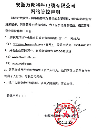 鄭重聲明:安徽萬邦特種電纜有限公司官方網站為:www_wanbangcable_com.048241.com,除此之外無任何子網站或合作網站,其余均為假冒偽劣。電話:0550-7621728 13485756353 地 址:安徽省天長市滁州高新技術產業開發區經四路29號